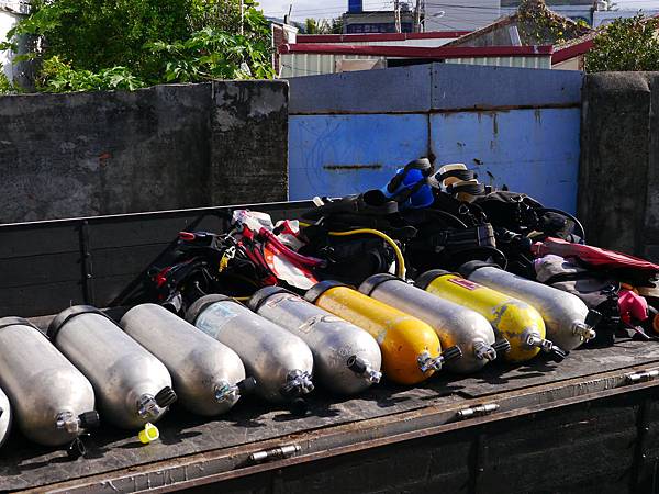 在哇哇哇再次令人驚呼的Reiko早餐時,補了昨天進度第三單元,越來來令人放空的學科,進度掌握得非常剛好,看完也吃完。外面天空好藍,迫不急待開門往外衝,整理裝備要出發囉!BCD、調節器、氣瓶、蛙鞋、手套、面鏡,謝謝Kevin的貼心,氣瓶們已排排躺在小貨卡上,讓我省去這步驟,準備就緒,輪流跳上小貨卡,〞側板不能坐,會抓的〞Kevin 對我說,怎麼看出我的意圖,但想想坐側板的確很危險,坐氣瓶上想當然爾安全些,大家各自找位子坐下,出發囉!